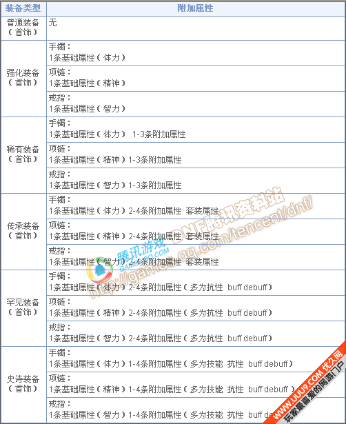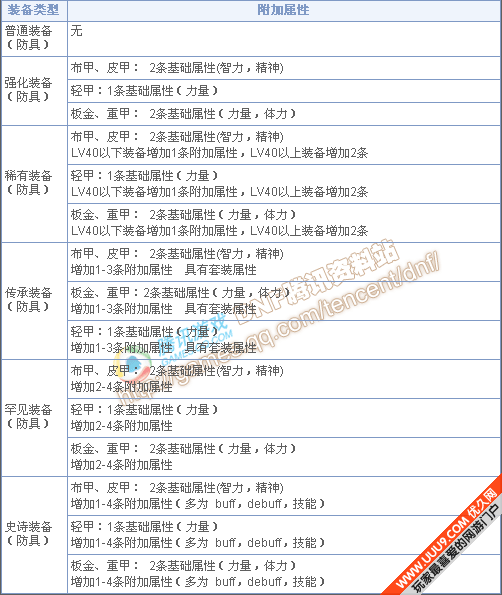 装备的属性可以分为固定属性、附加属性和套装属性。固定属性是同种类的装备必定会有的属性。附加属性是每件装备随机附加的属性。套装属性是当玩家穿戴的装备达到套装要求后被激活的属性。在DNF中同一件装备的附加属性是固定的。